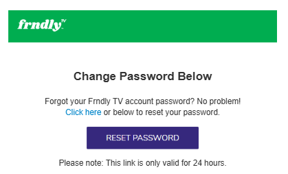 2. We’ll send you an email with the subject Frndly TV Password Reset. Click the purple RESET PASSWORD button in the email